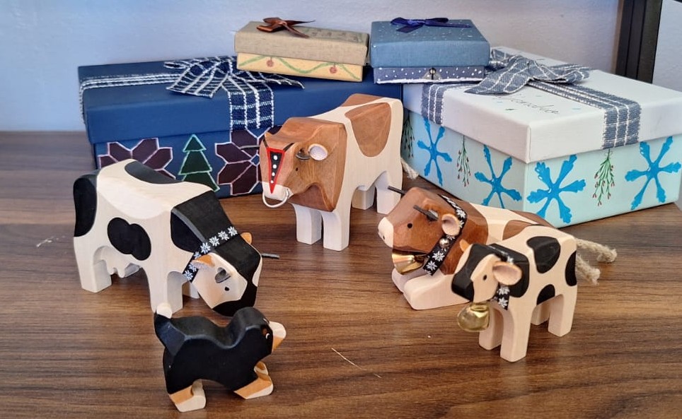 Nach dem Umzug und dem Schweizer Abendessen wurden dann die Geschenke aufgemacht. Das ist traditionellerweise in der Nacht zwischen dem 24. und 25. Dezember, genau um 00.00 Uhr. Ich habe meiner Gastfamilie Trauffer Holztiere geschenkt. Jeder bekam seine «eigene» Kuh. Auch die Hunde sind in der resultierenden Kuhfamilie als Figur vertreten.
